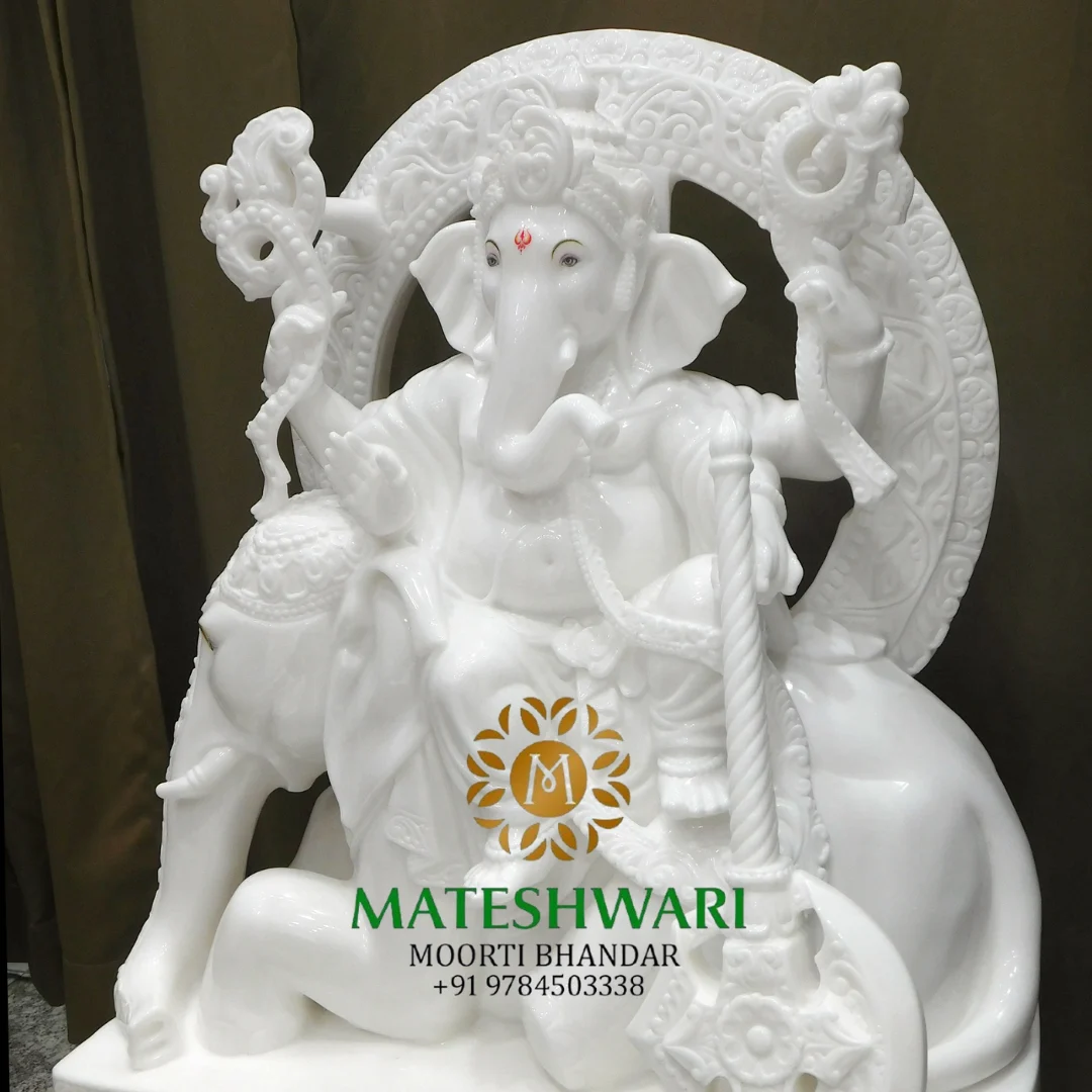 Shree Gajanand White Marble Ganesh Seated on Elephant with Ornamental Arch